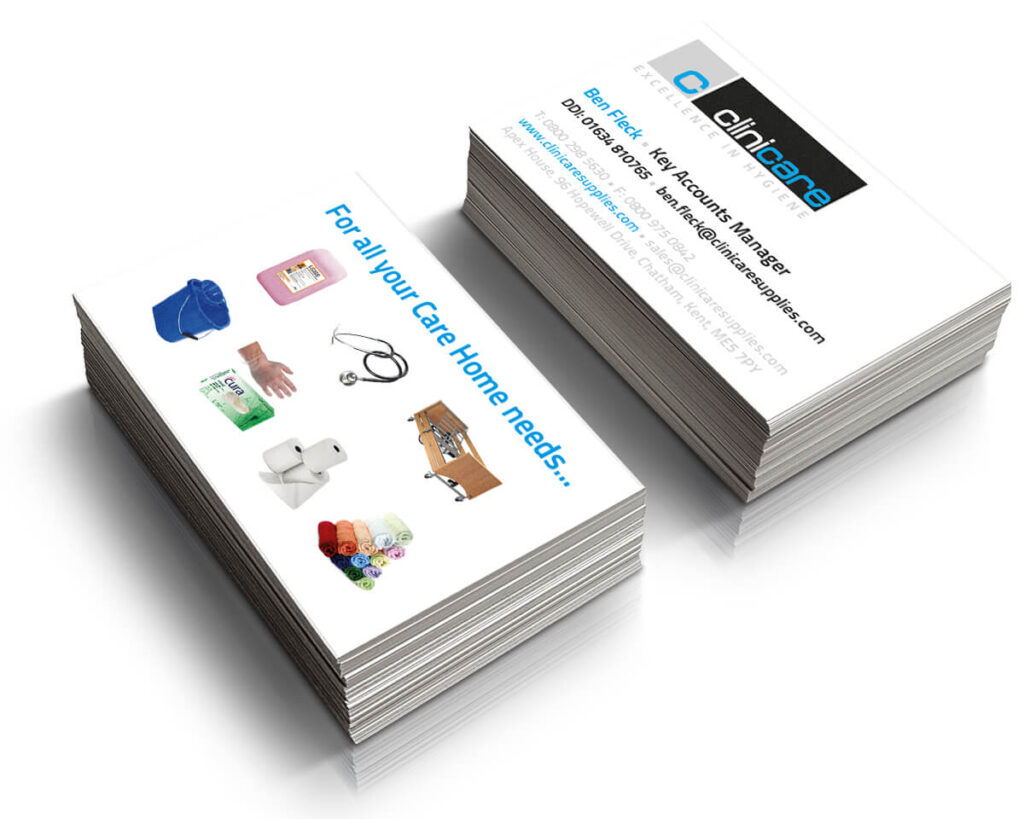 The identity was designed to match the core values of Clinicare. Using the existing brand colours of black white and silver we created a new logo that provided a balance between white and blue creating a strong “care” message to reflect the business sector that they work in. This also incorporated a silver marque that could be used on products. The logo included their tag line Excellence in Hygiene.