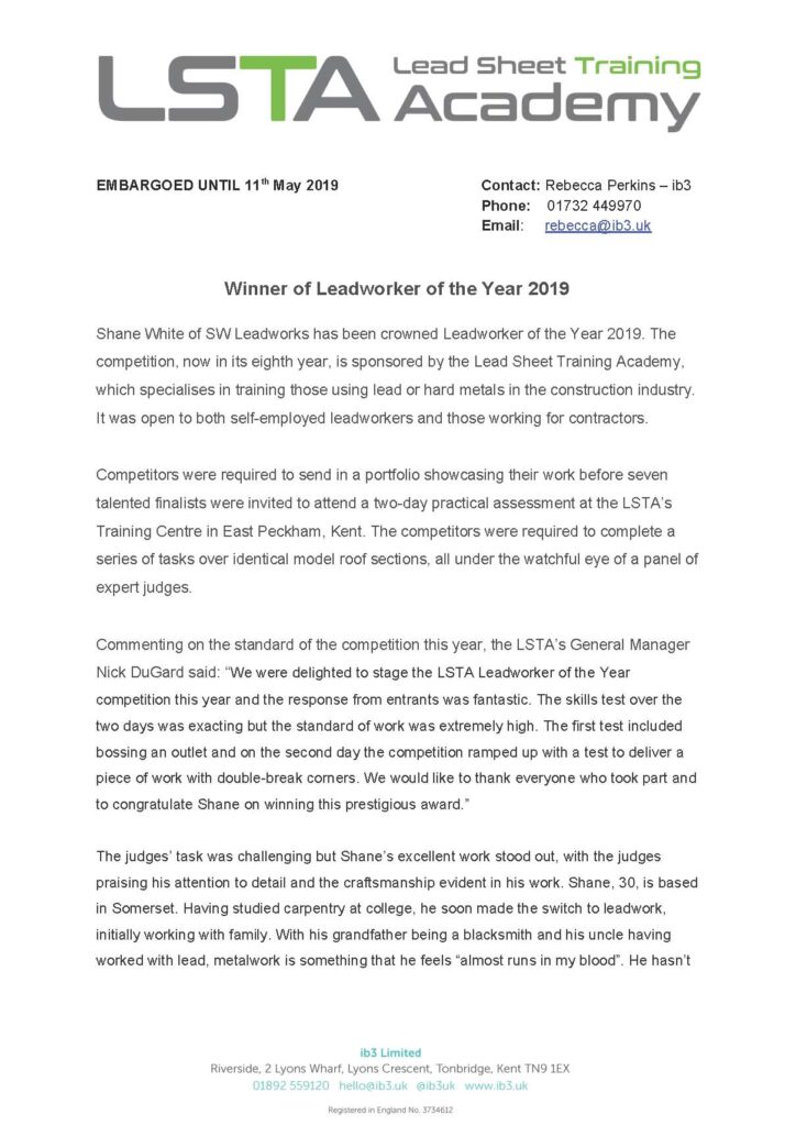 The Lead Sheet Training Academy provides specialised training courses for those using lead or hard metals in the construction industry. They came to us wanting to maximise press coverage of The Leadworker of the Year competition, which they run every year at their state-of-the-art training centre in Kent. The competition winner receives the Leadworker of the Year Award, which is presented as part of the UK Roofing Awards.